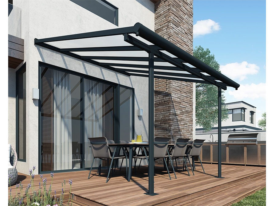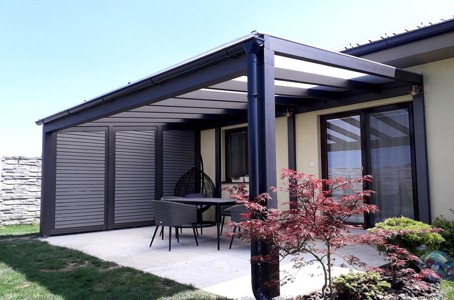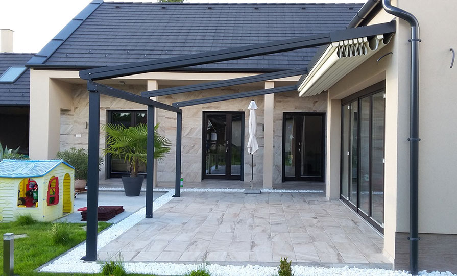 Ez a rendkívül esztétikus , modern megjelenésű üvegtetővel ellátott tökéletes árnyékoló eszköz megfelelő védelmet nyújt akár a hó és jég ellen is.
